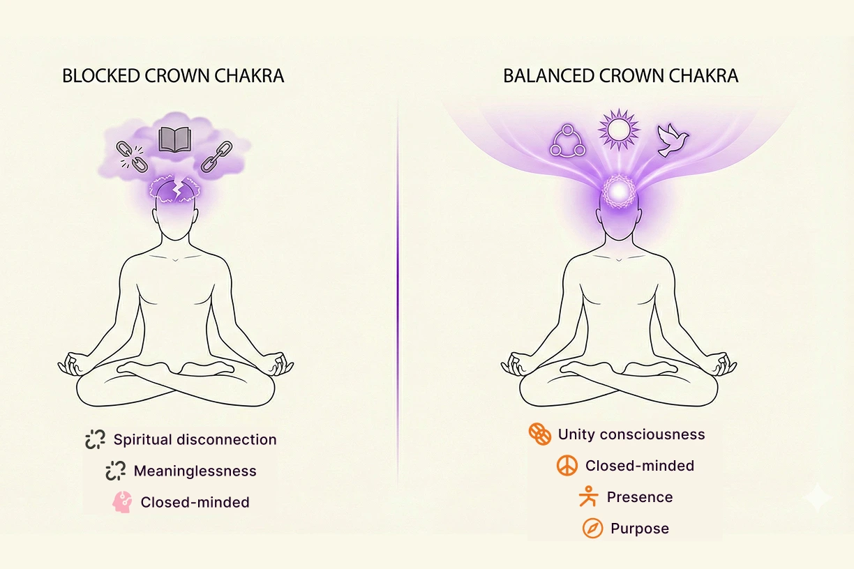 Signs of a blocked crown chakra may include feeling spiritually disconnected, a lack of meaning or purpose, rigid belief systems, excessive attachment to material identity, difficulty trusting life, chronic mental fog, or an inability to experience stillness. In some cases, spiritual bypassing—using spirituality to avoid real-life responsibilities—can also indicate imbalance.