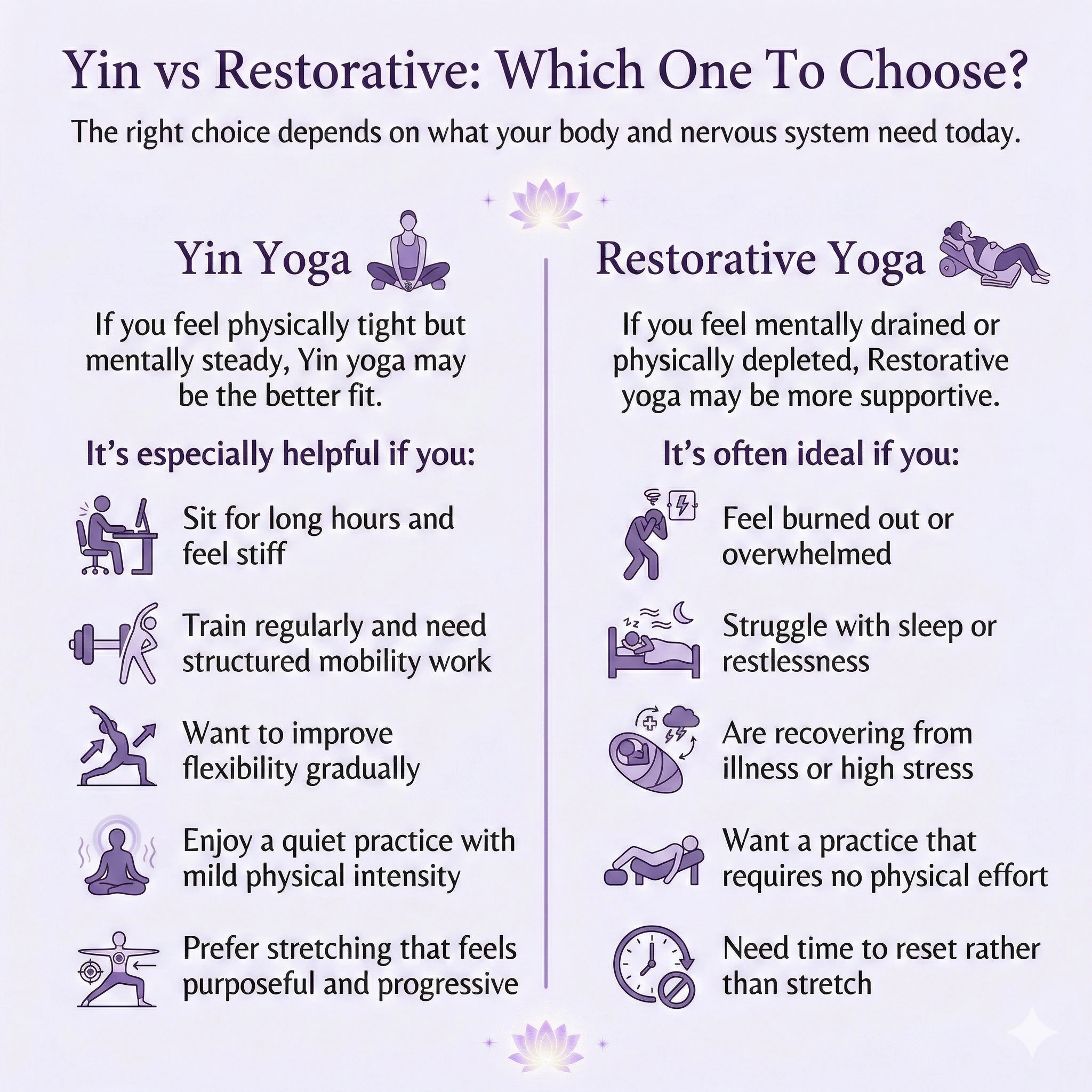 In short, choose Yin for tissue-focused mobility work. Choose Restorative for deep rest and reset.